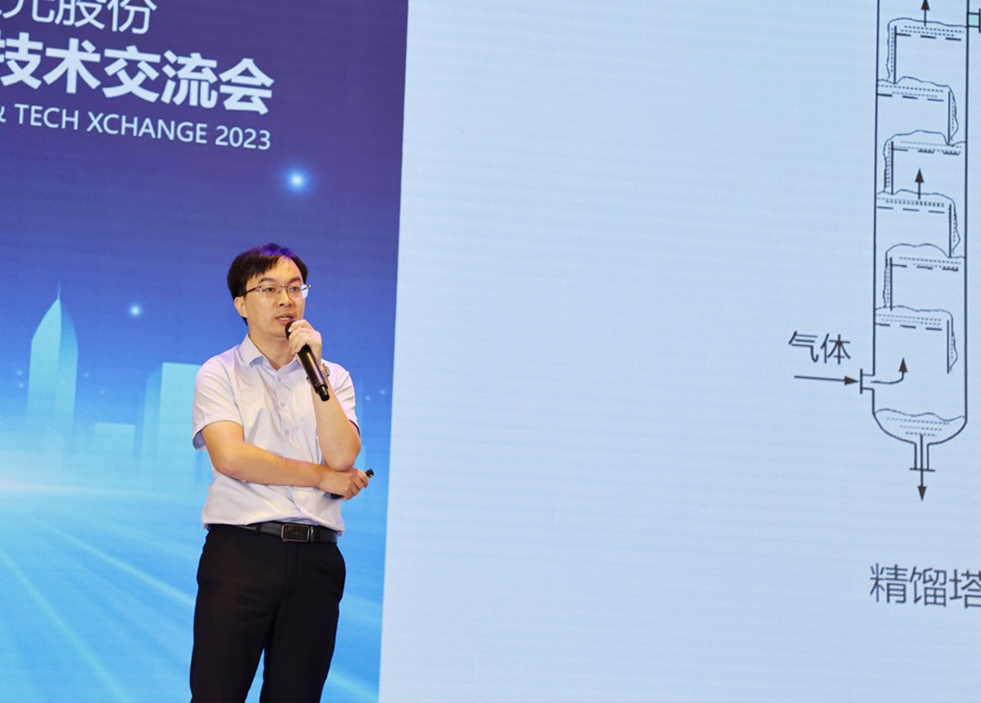 在主題演講環(huán)節(jié)中,亞光科技技術(shù)部經(jīng)理蔣曉霄為大家?guī)砹顺亓s及熱泵節(jié)能技術(shù)講解。熱泵精餾系統(tǒng)以亞光超重力精餾床為基礎(chǔ),結(jié)合旗下子公司樂恒MVR蒸汽再壓縮技術(shù),為客戶提供定制化的高效熱泵節(jié)能技術(shù)方案,有效解決了傳統(tǒng)精餾能耗高的缺點(diǎn),并具有分離效果好、節(jié)能優(yōu)勢明顯等優(yōu)點(diǎn)。